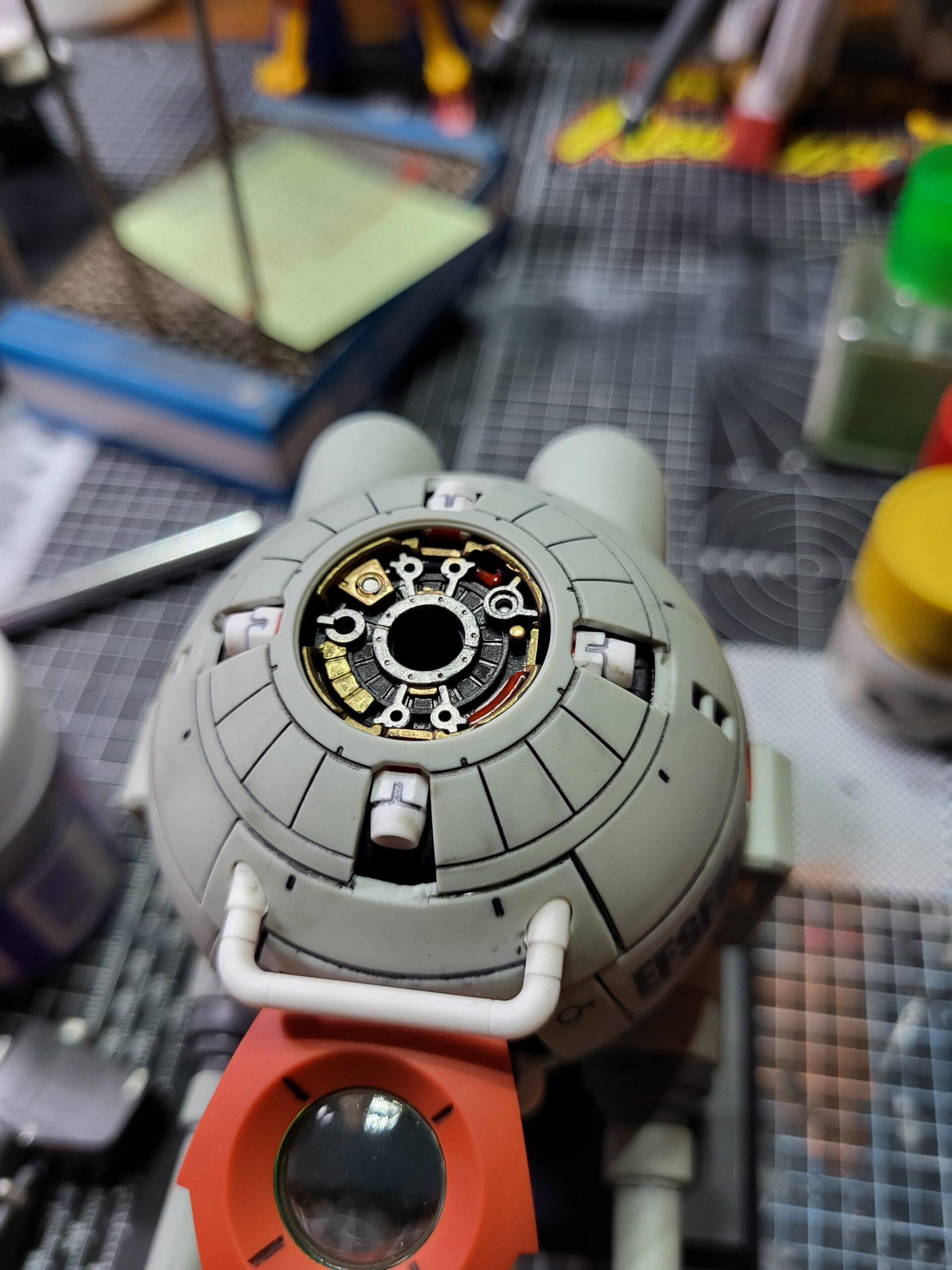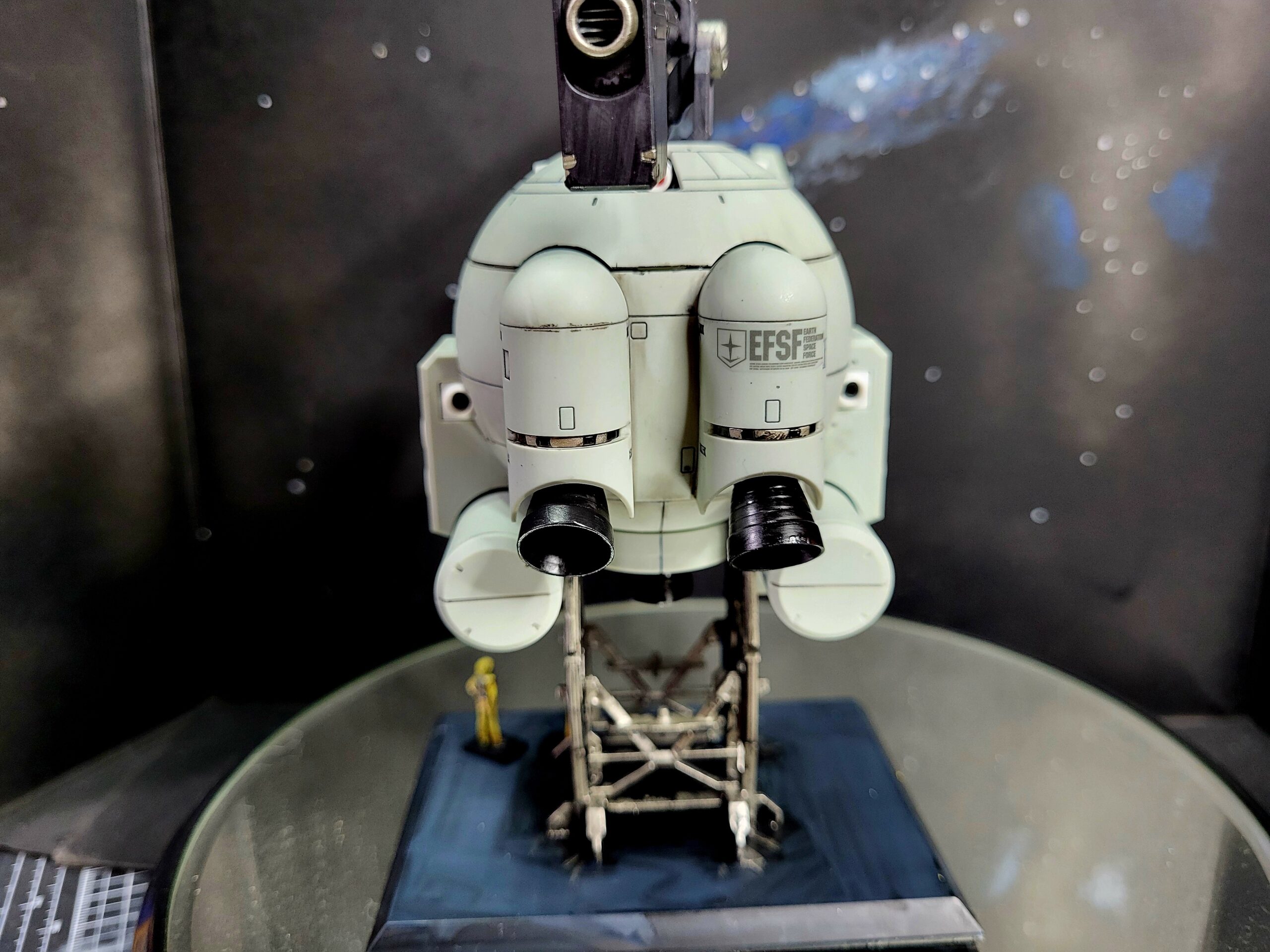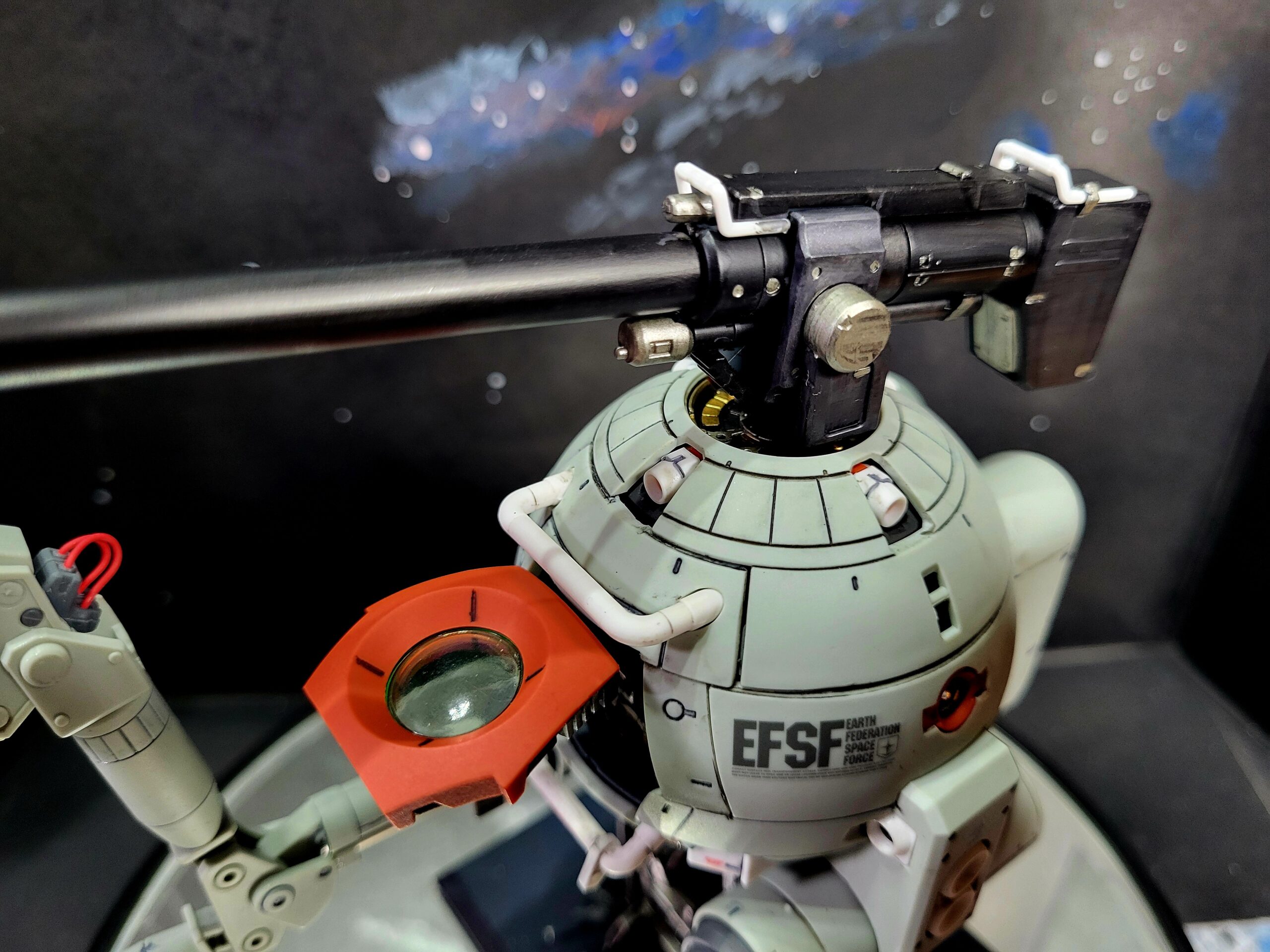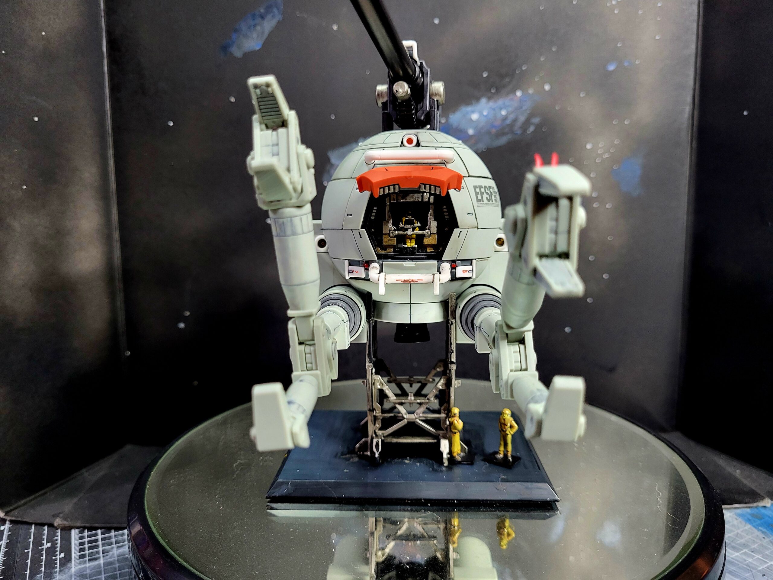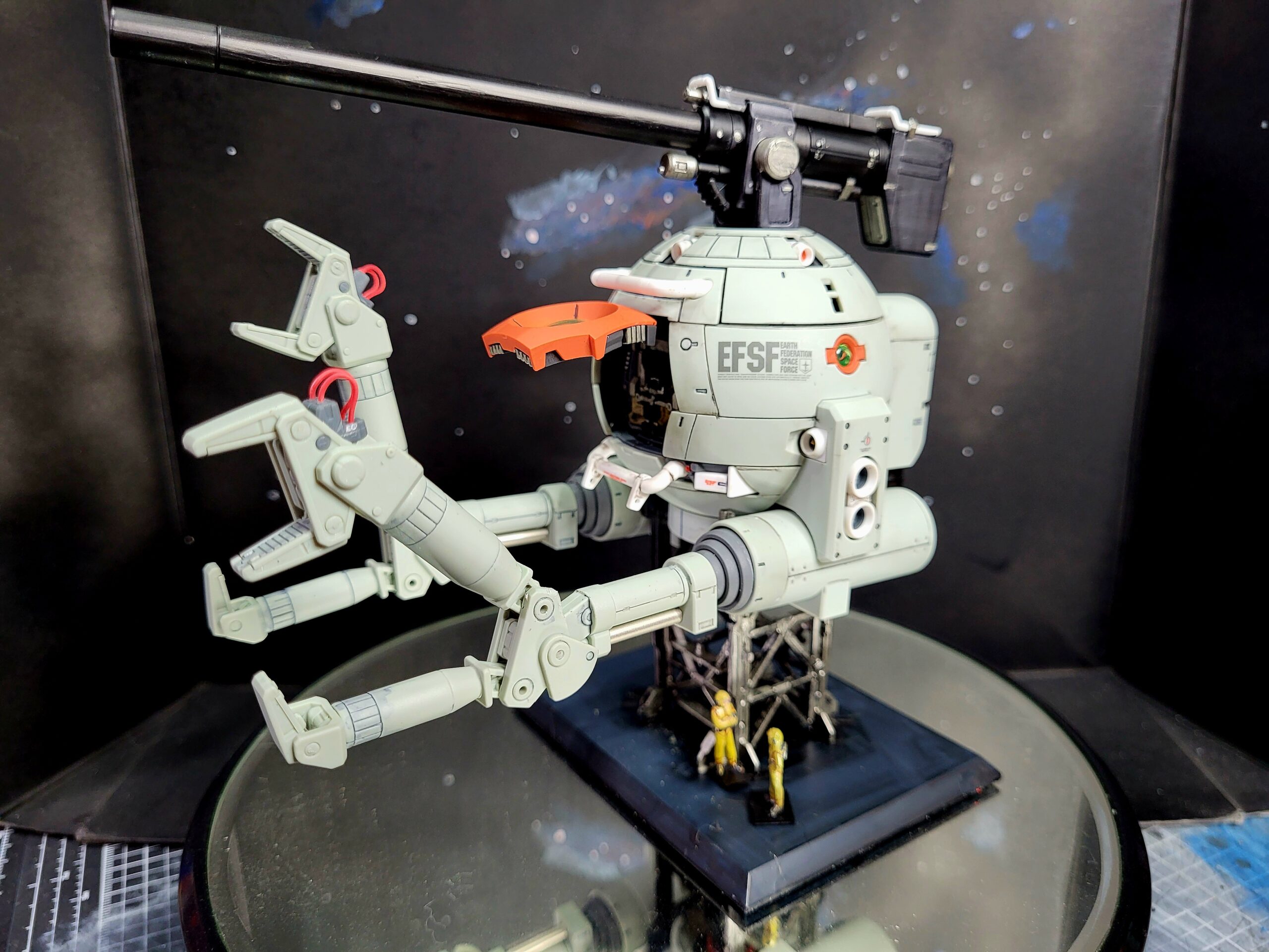 The MG Ball Ver. Ka, with painted detail on the parts of the inner frame which peek out from between the armour on it. I also did a custom paint job on the gun itself, applied some water decals (none of the dry transfer, those things are a terrible idea on a curved surface), and painted the figures of the dudes and pilot.